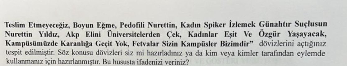 Ayrıca öğrencilere, “Boyun eğme, Pedofili Nurettin, Kadın spiker izlemek günahtır suçlusun Nurettin Yıldız, AKP elini üniversitelerden çek, Kadınlar eşit ve özgür yaşayacak, Kampüsümüzde karanlığa geçit yok, Fetvalar sizin kampüsler bizimdir” pankart ve dövizleri de soruldu. Öğrencilere, “Dövizleri siz mi hazırladınız ya da kim veya kimler tarafından eylemde kullanmanız için hazırlanmıştır?” sorusu yöneltildi.
