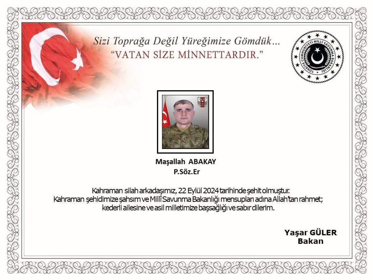 Bakanlıktan yapılan yazılı açıklamada, “Pençe Kilit Operasyon Bölgesinde, 22 Eylül 2024 tarihinde, bölücü terör örgütü mensupları tarafından yapılan sızma girişimi esnasında kahraman silah arkadaşımız Piyade Sözleşmeli Er Maşallah Abakay şehit olmuştur.