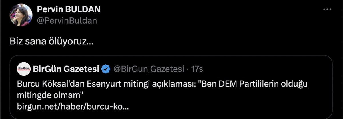 CHP'li Afyonkarahisar Belediye Başkanı Burcu Köksal, Esenyurt'ta düzenlenen mitinge katılmamasıyla ilgili, "Nerede ne zaman olacağımı başkaları değil ben bilirim" dedi. DEM Partili Pervin Buldan'dan da Köksal'a "Biz sana ölüyoruz" cevabı geldi.
