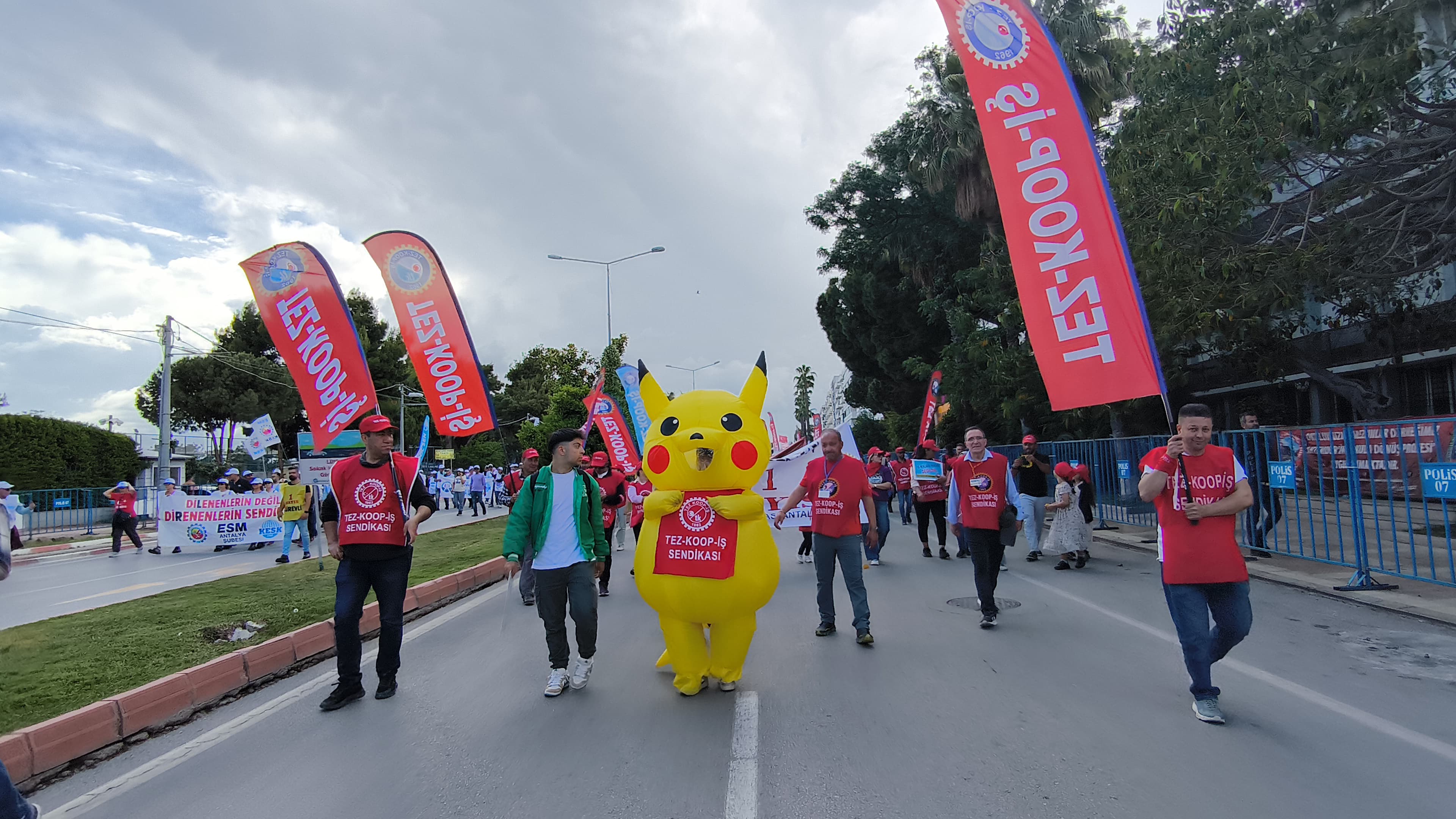 “TEZ-KOOP İş Sendikası” yazılı yelek giyen genç, alandaki katılımcılardan büyük ilgi gördü. Kutlamalara katılanlar, Pikachu kostümlü gençle şarkılar eşliğinde dans etti.