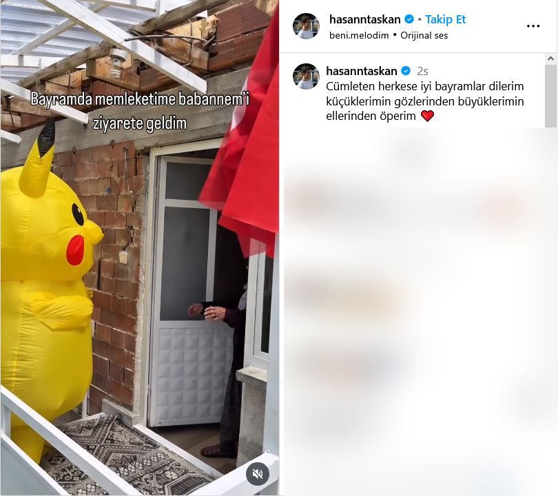 Taşkan, bu bayramda yüzleri güldüren bir video paylaştı. Pikachu kostümünü giyip babaannesini ziyaret eden Taşkan, bayramını kutladı. O anları sosyal medya hesabından da paylaştı.
