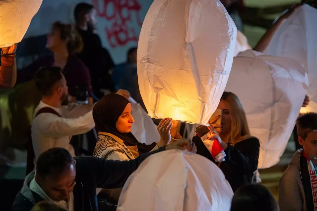 Anma etkinliğine katılanlar, Filistin halkıyla dayanışmalarını göstermek için Filistin bayrakları açtı, hazırlanan dilek fenerlerini havaya bıraktı.