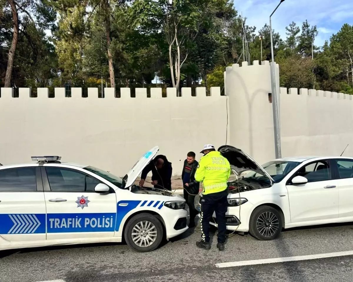 Bilecik’te polis ekipleri, yolda arızalanan otomobile akü takviyesi yaptı.