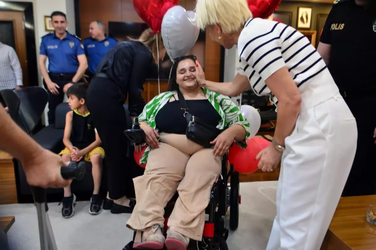 Polis ekipleri, Zozan Sevinç'e akülü tekerlekli sandalye hediye ederek mutluluk dolu bir sürpriz yaptı.