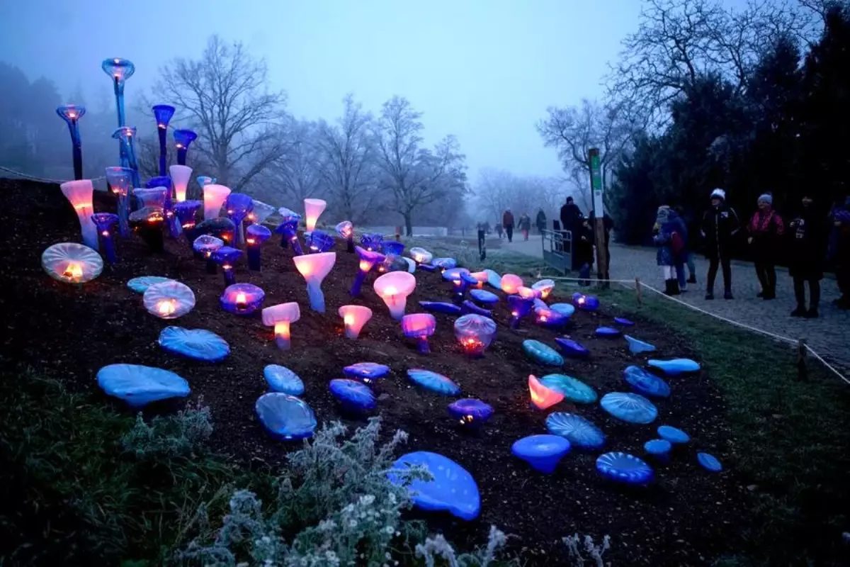 Prag Botanik Bahçesi'nde cam ve ışık enstalasyonları sergileniyor; sergi 2 Şubat 2025'e kadar açık.
