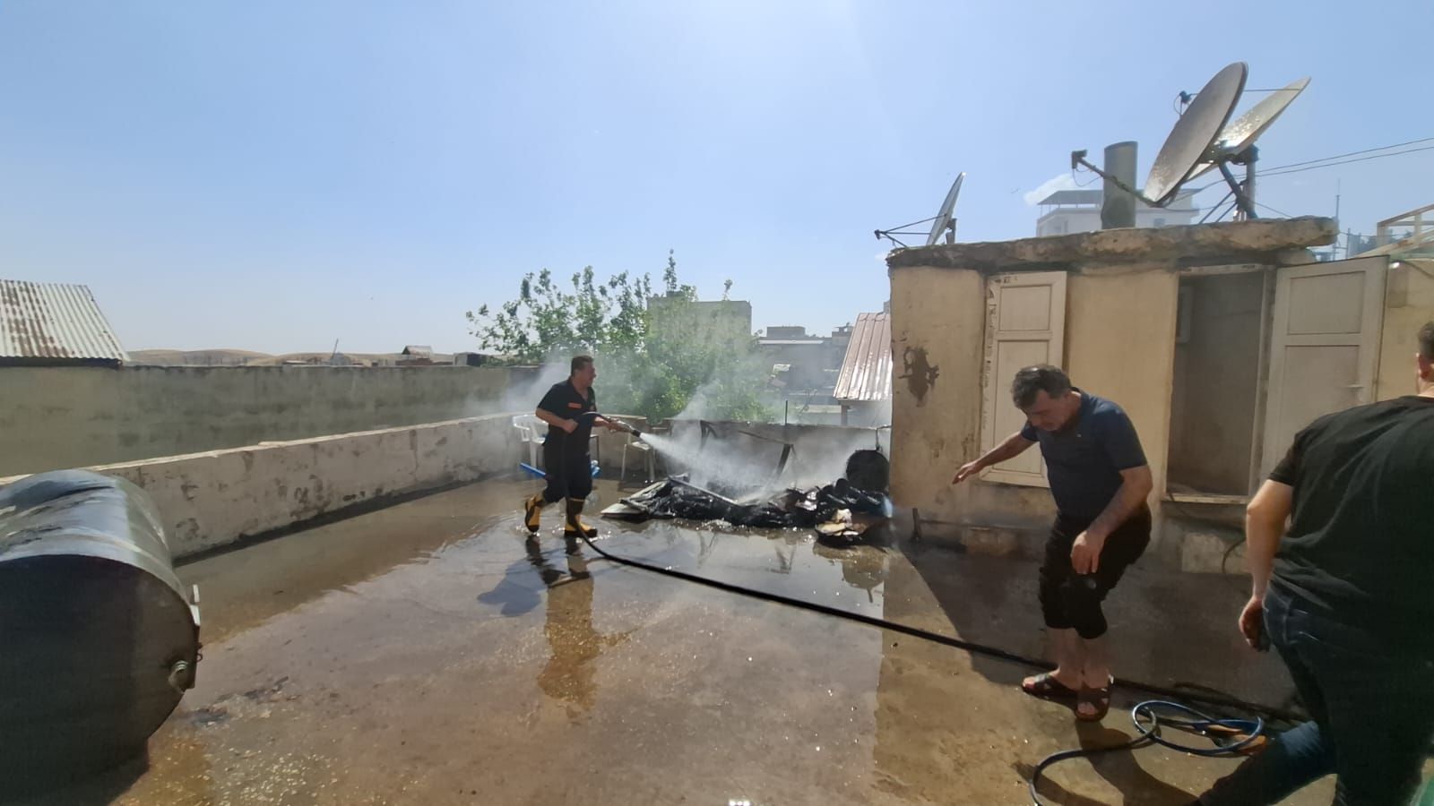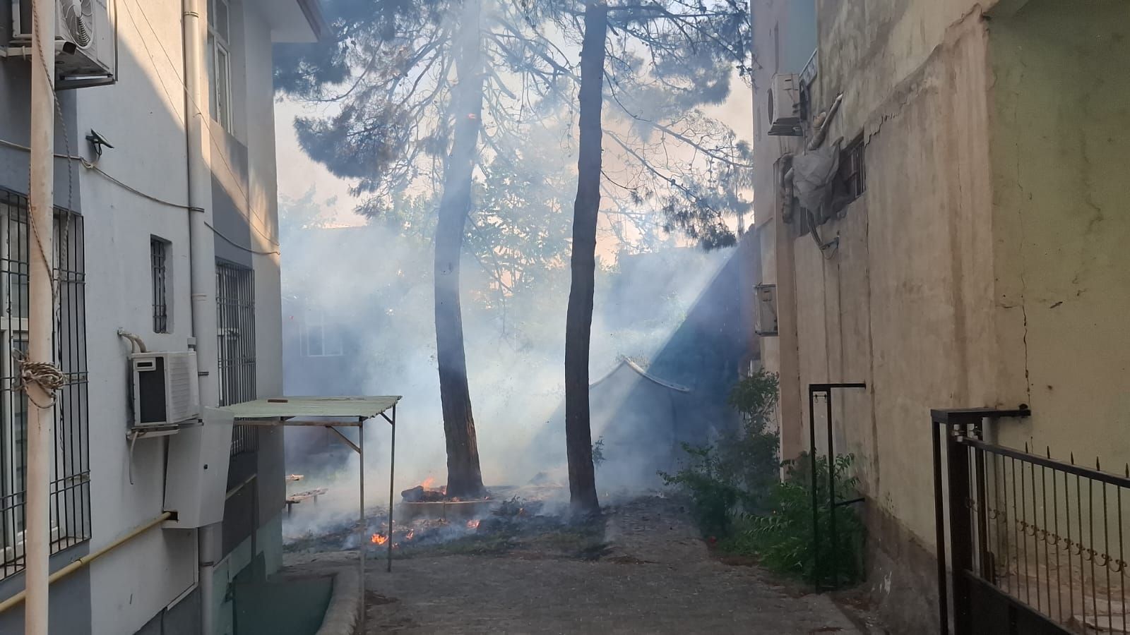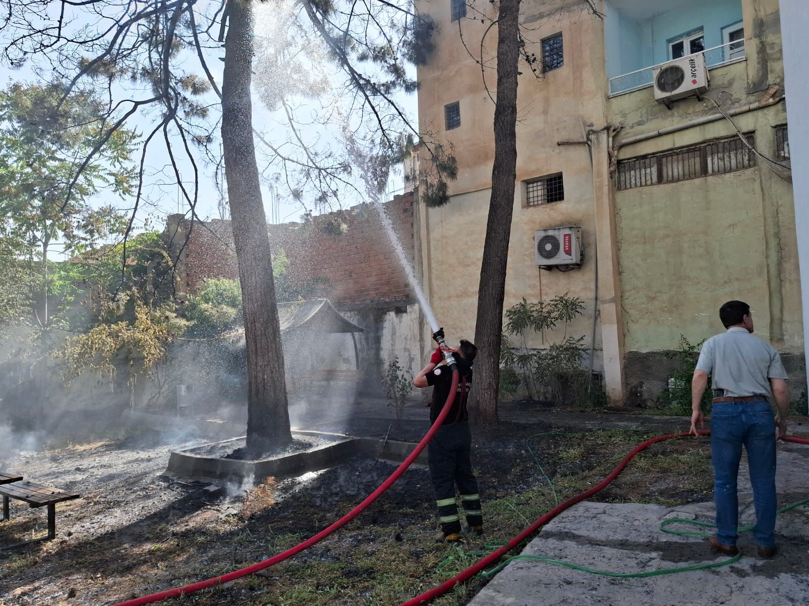 Öğleden sonra Sinan Mahallesi’ndeki RAM bahçesinde henüz belirlenemeyen bir sebeple çıkan yangın, bahçedeki çam ağacına ve ardından bitişikteki binanın çatısına yayıldı.