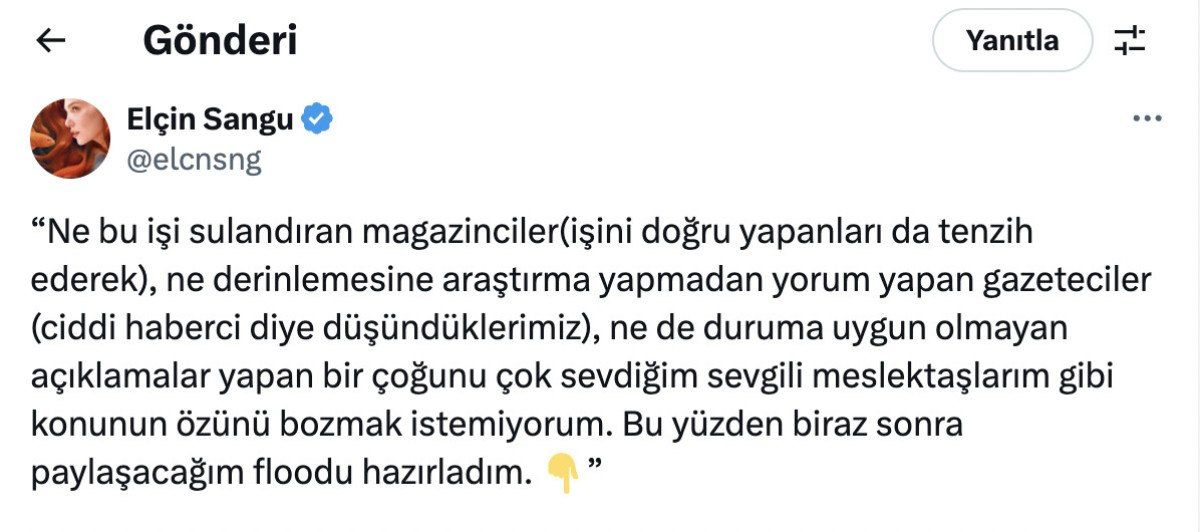 Bu ismlerden birisi olan Elçin Sangu, X hesabından “Ne bu işi sulandıran magazinciler(işini doğru yapanları da tenzih ederek), ne derinlemesine araştırma yapmadan yorum yapan gazeteciler (ciddi haberci diye düşündüklerimiz), ne de duruma uygun olmayan açıklamalar yapan bir çoğunu çok sevdiğim sevgili meslektaşlarım gibi konunun özünü bozmak istemiyorum. Bu yüzden biraz sonra paylaşacağım floodu hazırladım” dedi ve çarpıcı açıklamalarda bulundu.
