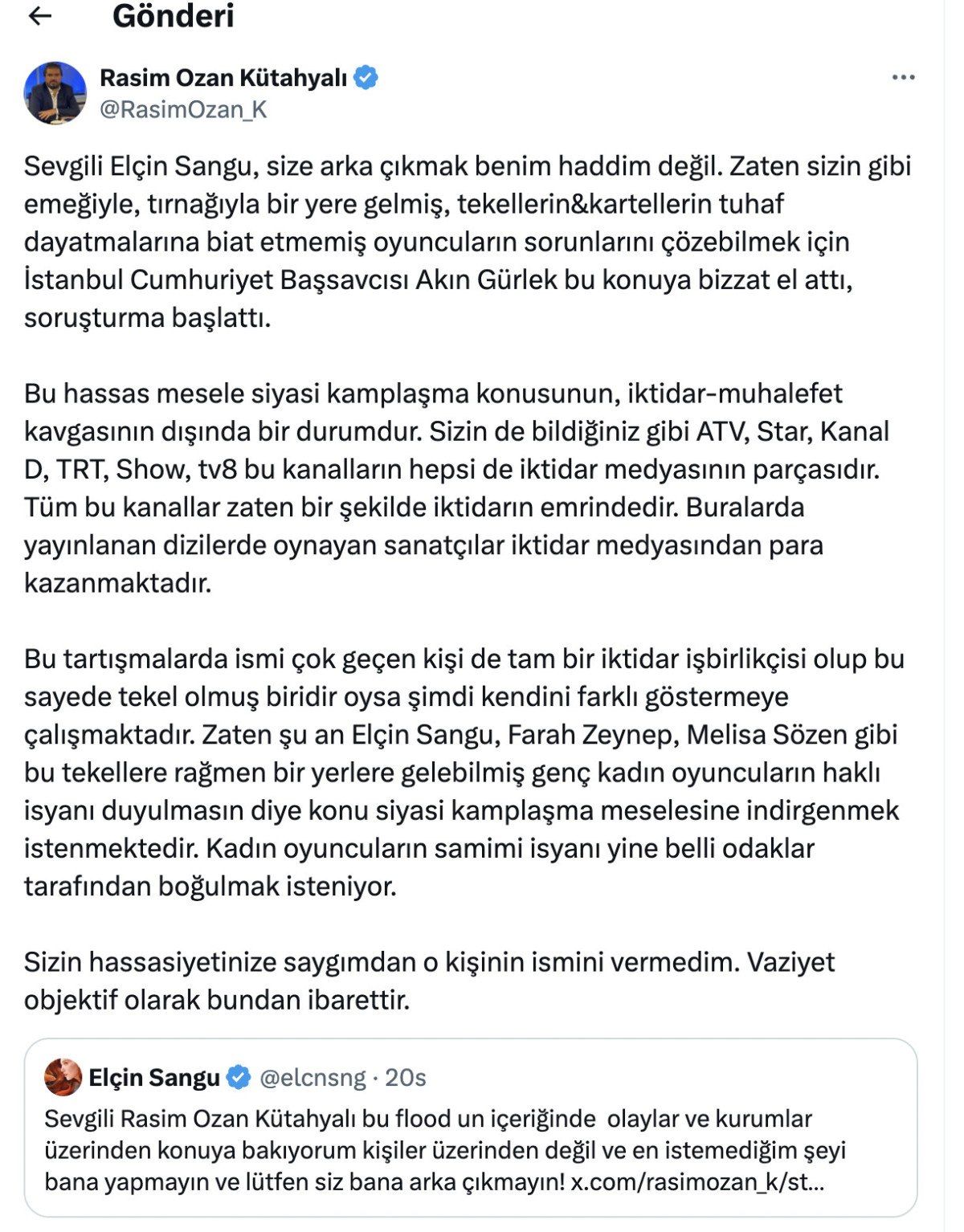Sevgili Elçin Sangu, size arka çıkmak benim haddim değil. Zaten sizin gibi emeğiyle, tırnağıyla bir yere gelmiş, tekellerin&kartellerin tuhaf dayatmalarına biat etmemiş oyuncuların sorunlarını çözebilmek için İstanbul Cumhuriyet Başsavcısı Akın Gürlek bu konuya bizzat el attı, soruşturma başlattı. Bu hassas mesele siyasi kamplaşma konusunun, iktidar-muhalefet kavgasının dışında bir durumdur.