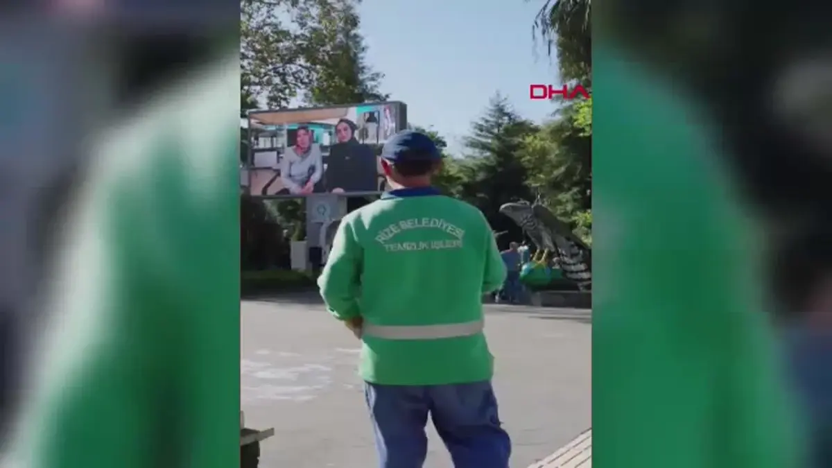 RİZE Belediyesi temizlik personeli İsmail Yılmaz’a, 52’nci yaş gününde ailesi ve belediye çalışanları tarafından sürpriz doğum günü kutlaması yapıldı. Çalışırken meydandaki dev ekranda ailesinin video mesaj ile doğum gününü kutladığı Yılmaz, duygusal anlar yaşadı.