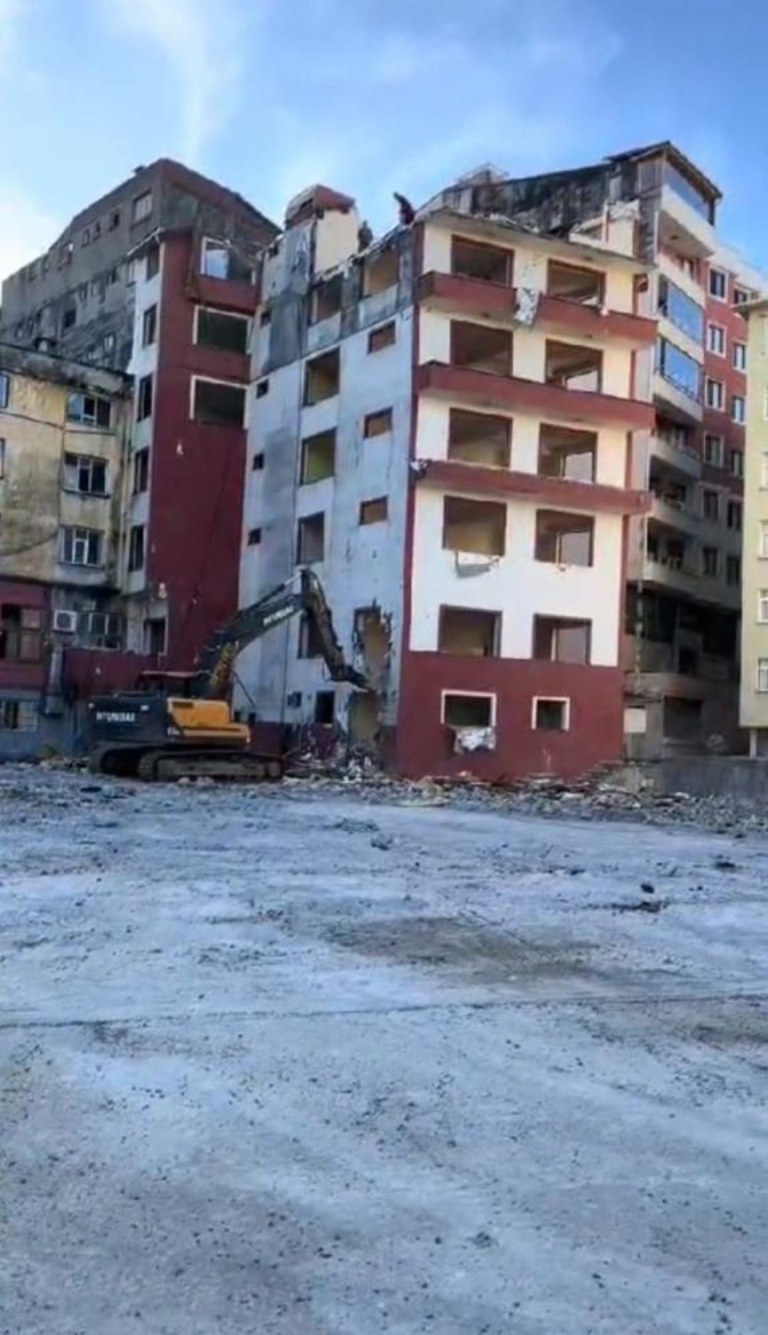 Çevredeki bir vatandaş tarafından kayda alınan görüntülerde 6 katlı bir binanın yıkımı sırasında binanın en üst katında 2 işçi bulunmasına rağmen altta bulunan iş makinesi yıkımı sürdürüyor.