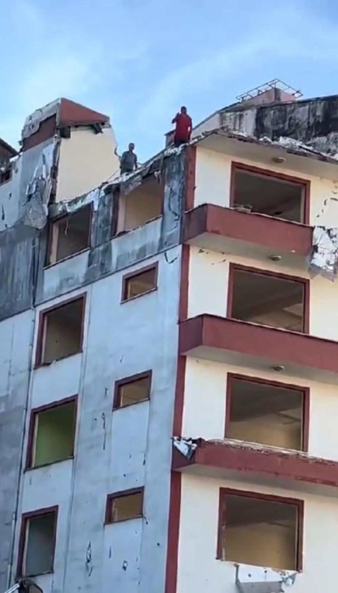 Çevredeki bir vatandaş tarafından kayda alınan görüntülerde 6 katlı bir binanın yıkımı sırasında binanın en üst katında 2 işçi bulunmasına rağmen altta bulunan iş makinesi yıkımı sürdürüyor.