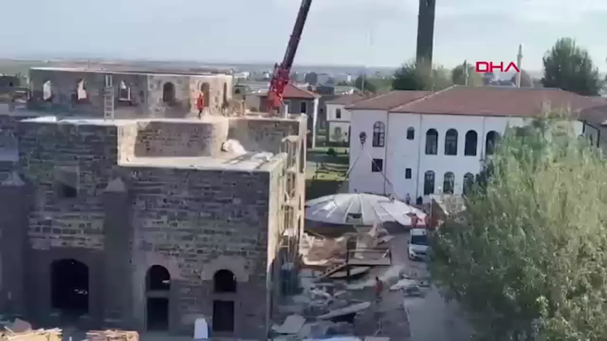 KAHRAMANMARAŞ merkezli depremlerde ağır hasar aldıktan sonra restore edilmeye başlanan Diyarbakır’daki 1600 yıllık Saint George Kilisesi’nin yaklaşık 100 yıldır olmayan kubbesi, yenisi hazırlanarak vinçle yerleştirildi. Diyarbakır Rölöve ve Anıtlar Müdürü Cemil Koç, “40 metre çevre genişliğinde, 14 metre çapında ahşap konstrüksiyon üzerine polikarbon malzeme ile bir kubbe örtü oluşturduk. Burada, gelen ziyaretçilerin zihninde yer edinmiş olan gökyüzü ile görsel bağını koparmadan tekrar bir örtü ile kapatılması hedeflenmişti” dedi.