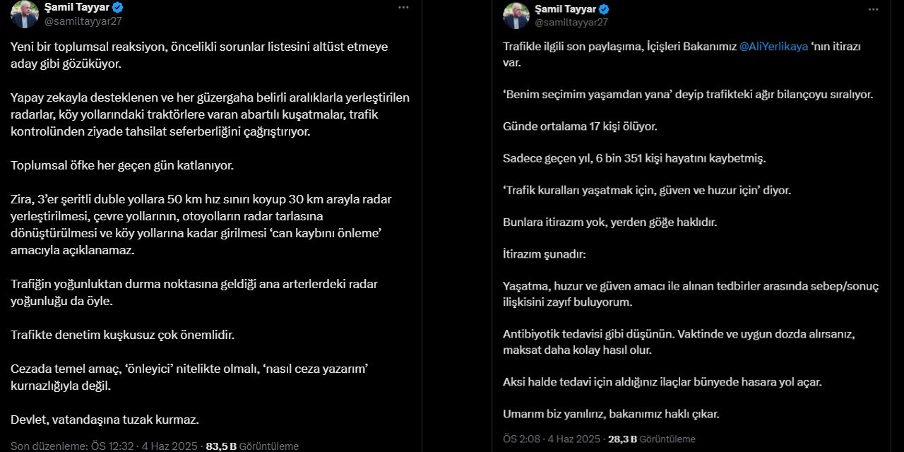 Eski AKP milletvekili Şamil Tayyar, denetimlerin fazlalığından şikayet ederek köy yollarına kadar kurulan trafik kontrollerinden şikayet etti. “Köy yollarındaki traktörlere varan abartılı kuşatmalar, trafik kontrolünden ziyade tahsilat seferberliğini çağrıştırıyor” diyen Şamil Tayyar, cezaların amacının dışına çıktığını söyledi.