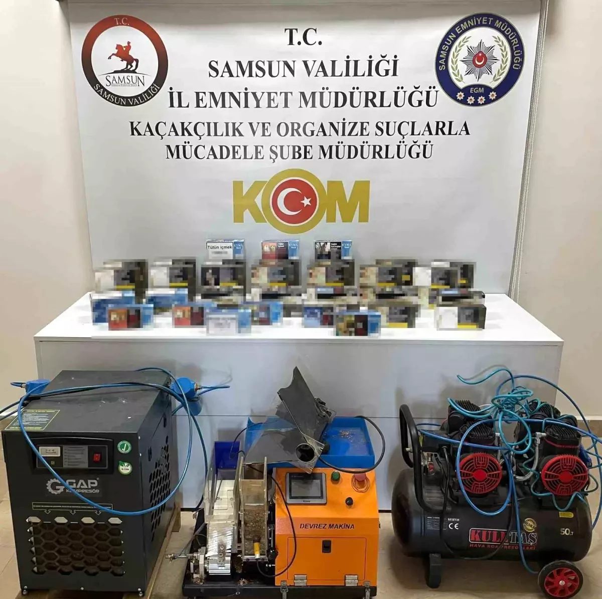 Samsun’da yapılan takip ve çalışma sonucu kaçak makaron ve sigara sarma makinesi ele geçirildi.