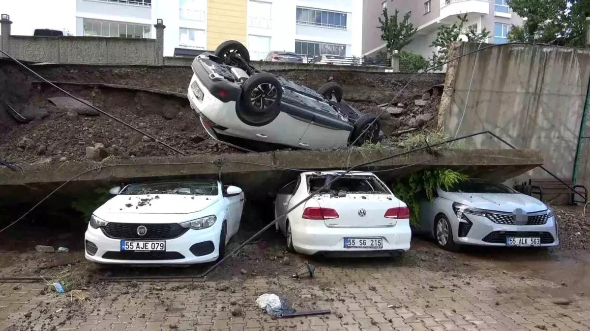 Samsun'un Atakum ilçesinde etkili olan kuvvetli sağanak, istinat duvarının çökmesine neden oldu. Olay, 4 aracın kullanılamaz hale gelmesine yol açarken, site sakinleri durumu endişeyle karşıladı.