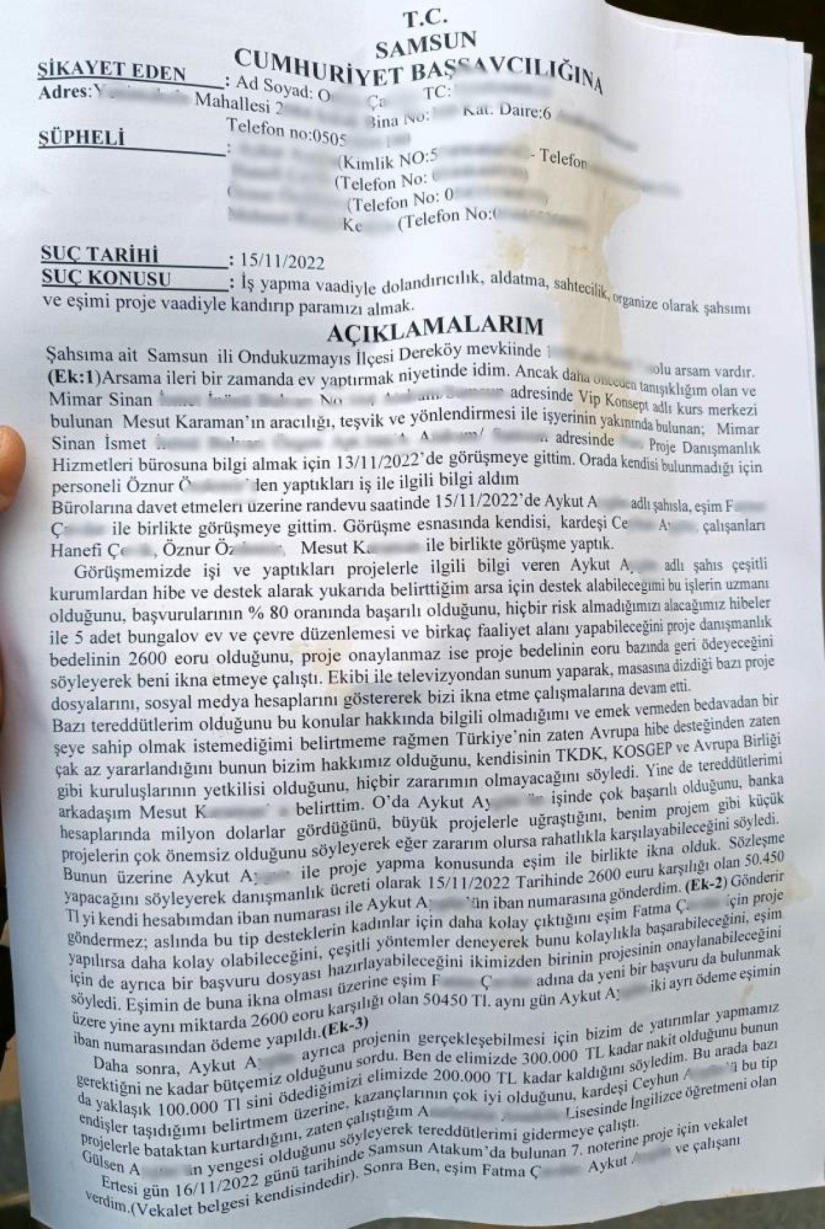 “Zirai drone projesi, imar projesi, tekstil atölyesi projesi, su tesisatı projesi, tıbbi-aromatik bitki üretimi projesi, sulama birliği projesi” gibi farklı sahte projeler ile Avrupa Birliği (AB) hibeleri ve devlet desteklerinden yararlanma ve yüksek kazanç elde etmeyi vadeden Aykut A. ve iş birlikçilerinin, onlarca kişiyi ikna ederek milyonlarca lira parasını aldığı ileri sürüldü.
