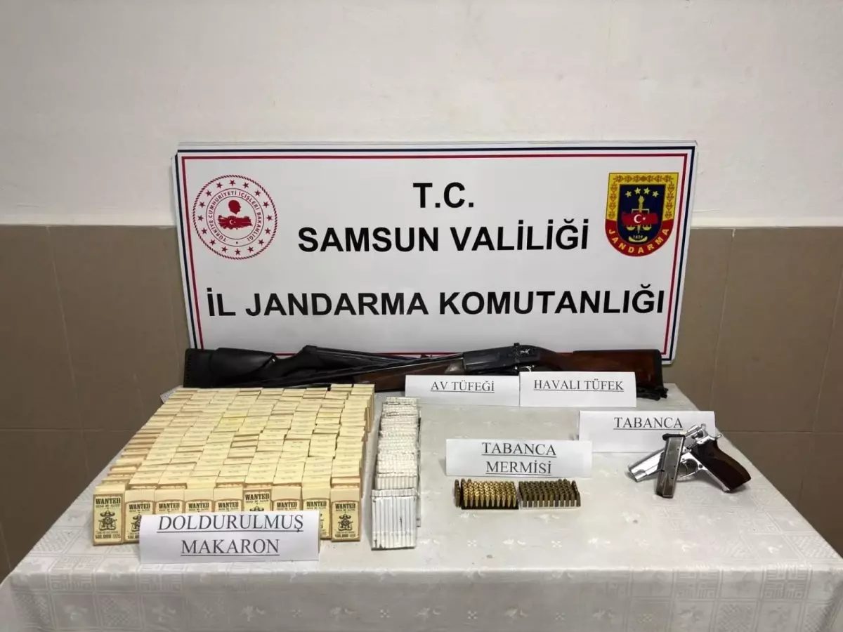 Edinilen bilgilere göre, Samsun İl Jandarma Komutanlığı Kaçakçılık ve Organize Suçlarla Mücadele Şube Müdürlüğü ile Havza İlçe Jandarma Komutanlığı ekipleri, kaçak tütün ürünleri satışı yaptığı tespit edilen A.K. (69) isimli şahsın evinde arama gerçekleştirdi. Yapılan aramada, 8 bin 500 dal içi tütün doldurulmuş makaron, 1 adet ruhsatsız tabanca, 114 adet tabanca fişeği, 1 adet ruhsatsız av tüfeği ve 1 adet havalı tüfek ele geçirildi.