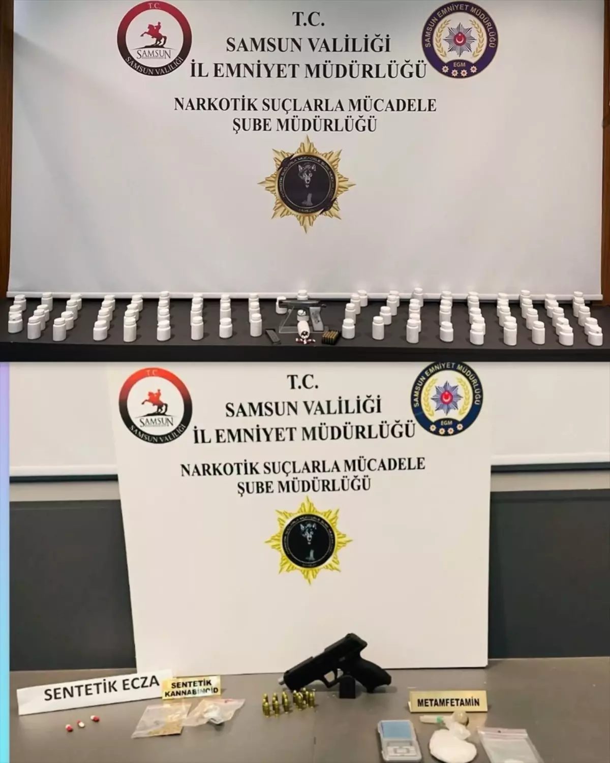 Belirlenen adreslere düzenlenen operasyonda yapılan aramada, 5 bin 568 sentetik ecza hapı, 40 gram sentetik uyuşturucu, hassas terazi, 2 ruhsatsız tabanca, 43 tabanca fişeği, 1,5 gram esrar ile uyuşturucu kullanım aparatı ele geçirildi.