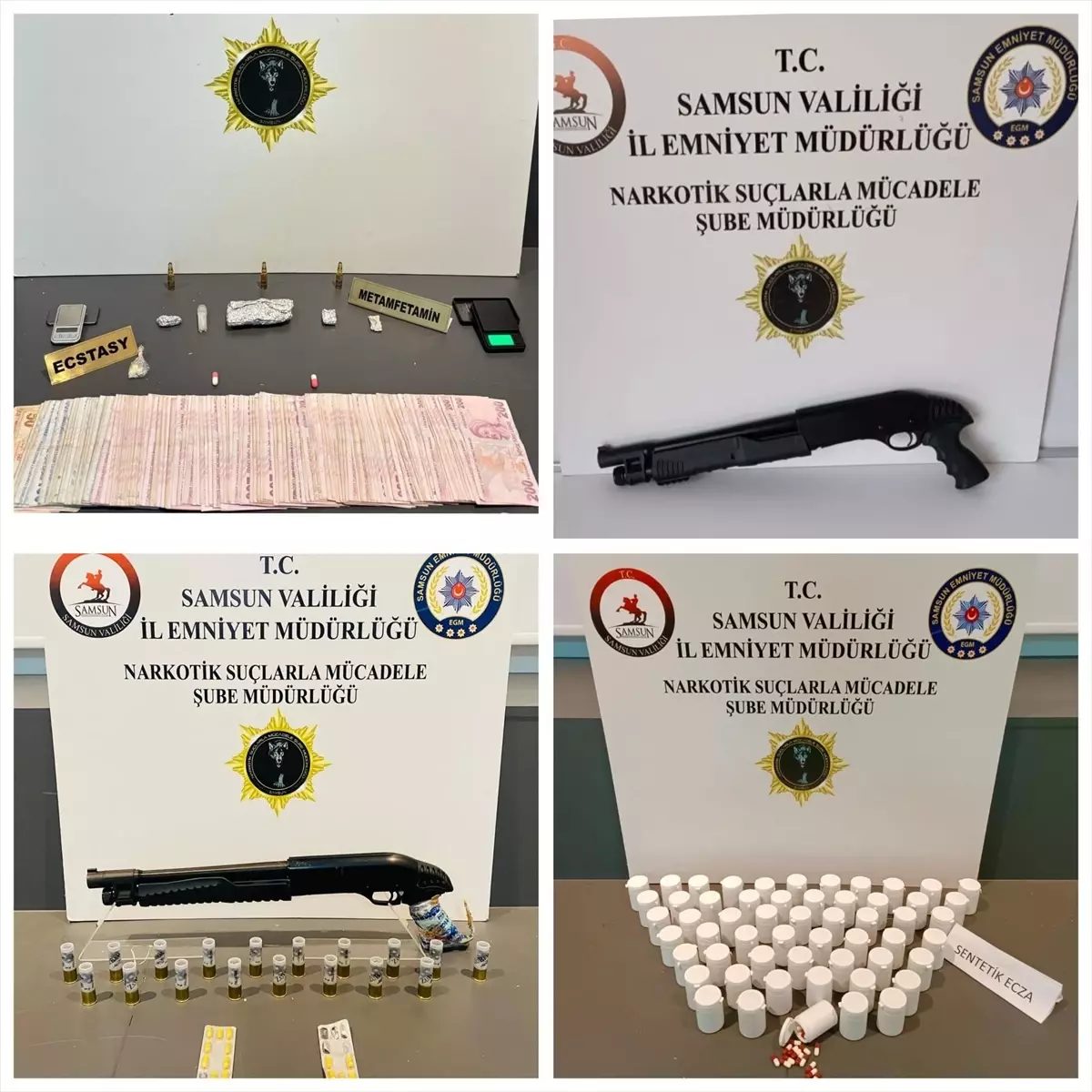 Adreslerde yapılan aramalarda,1093 sentetik ecza hapı, çeşitli miktarlarda uyuşturucu, 5 uyuşturucu madde kullanma aparatı, 3 hassas terazi, 2 ruhsatsız pompalı tüfek ile uyuşturucu madde ticaretinden elde edildiği değerlendirilen bir miktar para ele geçirildi.