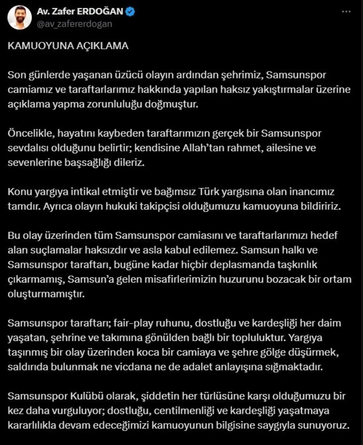 Süper Lig’in 4’üncü haftasında Trabzonspor ile deplasmanda karşılaşacak olan Samsunspor’un taraftar grubu, iddiaya göre, maça saatler kala Giresun’da mola verdikleri bir restoranda silahlı saldırıya uğradı. Saldırının ardından ağır yaralanan Samsunsporlu taraftar Ümit Çapkın (43), kaldırıldığı hastanede yapılan tüm müdahalelere rağmen hayatını kaybetti. Yaşanan olayın ardından Sosyal medya üzerinden açıklamada bulunan Av. Zafer Erdoğan, “Konu yargıya intikal etmiştir ve bağımsız Türk yargısına olan inancımız tamdır. Ayrıca olayın hukuki takipçisi olduğumuzu kamuoyuna bildiririz. Bu olay üzerinden tüm Samsunspor camiasını ve taraftarlarımızı hedef alan suçlamalar haksızdır ve asla kabul edilemez. Samsun halkı ve Samsunspor taraftarı, bugüne kadar hiçbir deplasmanda taşkınlık çıkarmamış, Samsun’a gelen misafirlerimizin huzurunu bozacak bir ortam oluşturmamıştır” diye konuştu.