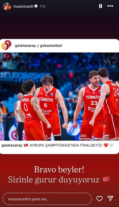 Türkiye’nin Yunanistan’ı 94-68 mağlup ederek EuroBasket 2025 finaline yükselmesinin ardından Galatasaray’ın yıldızı Mauro Icardi, sosyal medyadan yaptığı paylaşımla milli takıma destek verdi.