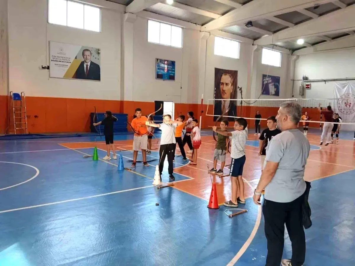 Sarıgöl'deki okçuluk kursu gençlerin büyük ilgisini çekti, hedefi tam isabetle vurmayı öğreniyorlar.