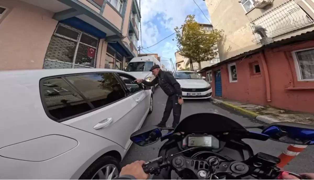 Sarıyer'de bir servis şoförü ile otomobil sürücüsü arasında çıkan yol verme tartışması, otomobildeki kadının 'Gaziysen git evinde otur' sözleriyle alevlendi. Olay, bir motosikletlinin kask kamerasına yansıdı.
