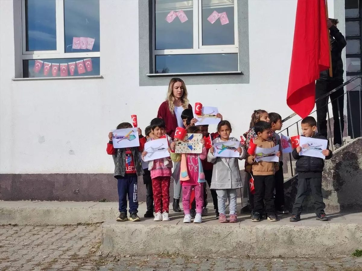 Okulun 76 öğrencisi, öğretmenleri eşliğinde bir araya gelerek ellerinde Türk bayrakları ve TUSAŞ’ın ürettiği uçak tasarımlarıyla saygı duruşunda bulundu.