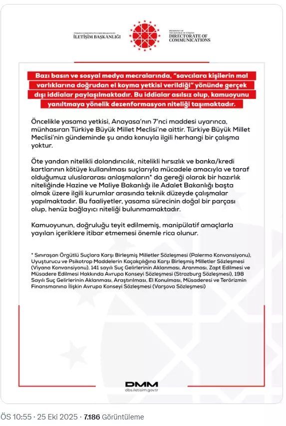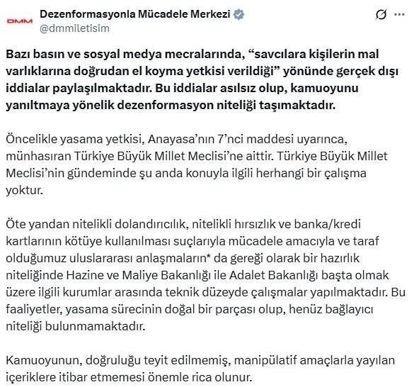 Açıklamada şu ifadelere yer verildi: “Bazı basın ve sosyal medya mecralarında, “savcılara kişilerin mal varlıklarına doğrudan el koyma yetkisi verildiği” yönünde gerçek dışı iddialar paylaşılmaktadır. Bu iddialar asılsız olup, kamuoyunu yanıltmaya yönelik dezenformasyon niteliği taşımaktadır. Öncelikle yasama yetkisi, Anayasa’nın 7’nci maddesi uyarınca, münhasıran Türkiye Büyük Millet Meclisi’ne aittir. Türkiye Büyük Millet Meclisi’nin gündeminde şu anda konuyla ilgili herhangi bir çalışma yoktur.