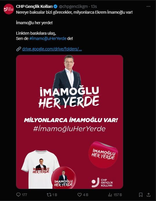 Savcılığı son görüntü yasağı kararına karşı bu kez CHP Gençlik Kolları karşı kampanya düzenledi. İmamoğlu görseli bulunan t-shirt, bayrak, rozet, sticker’ın yer aldığı ürünleri bastıran CHP’li gençler “İmamoğlu Her Yerde” kampanyasını başlattı.