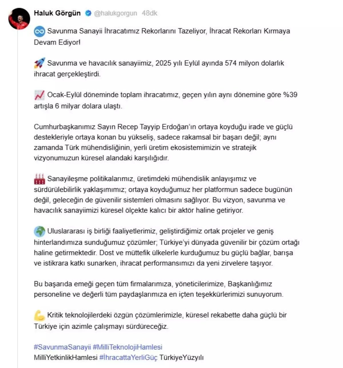 SAVUNMA Sanayii Başkanı Haluk Görgün, "Savunma ve havacılık sanayiimiz, 2025 yılı Eylül ayında 574 milyon dolarlık ihracat gerçekleştirdi" dedi.