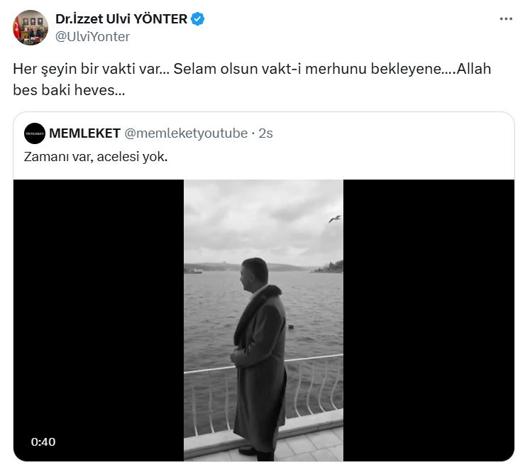 Bu paylaşıma yanıt veren MHP’li Yönter, “Her şeyin bir vakti var… Selam olsun vakt-i merhunu bekleyene… Allah bes, baki heves…” dedi.