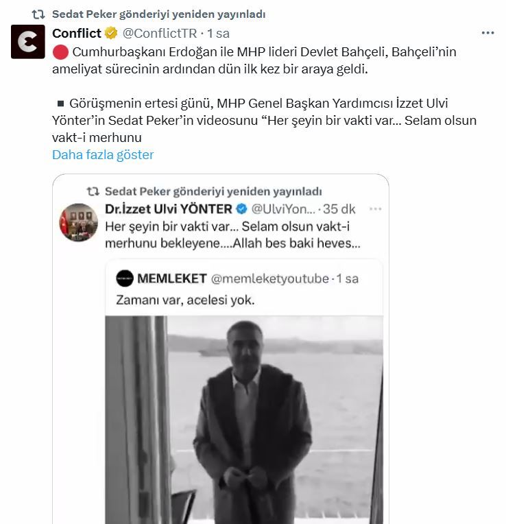 Özellikle Peker’in, MHP Genel Başkanı Devlet Bahçeli ile Cumhurbaşkanı Recep Tayyip Erdoğan‘ın aylar sonra gerçekleştiridiği görüşme ile bağdaştırılıldığı bir paylaşımı yeniden paylaşması dikkat çekti.