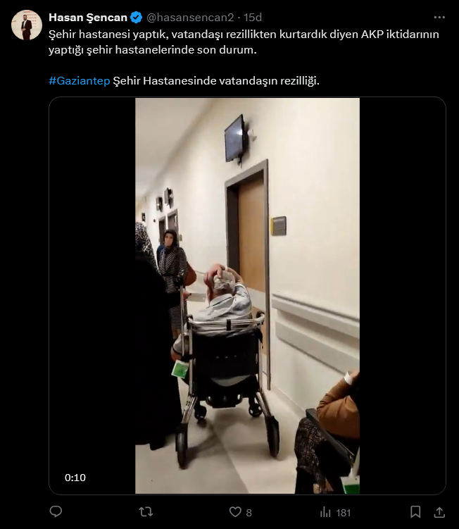 Gaziantep Büyükşehir Belediye Meclisi CHP Grup Sözcüsü Hasan Şencan da hasta yakınının videosunu paylaşıp şunları ifade etti: