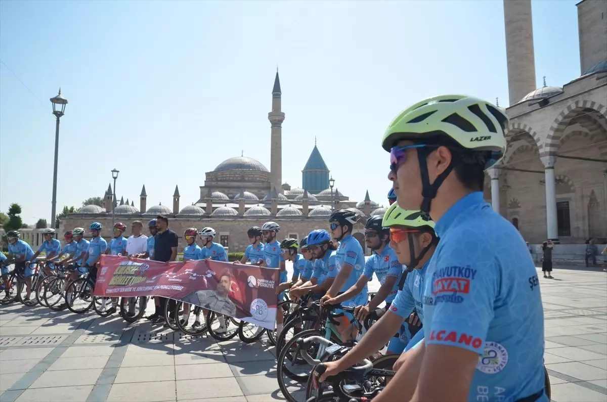 Fetullahçı Terör Örgütü’nün (FETÖ) 15 Temmuz 2016’daki darbe girişiminde şehit düşenleri ve yaralananları anmak amacıyla bu yıl 9’uncusu düzenlenen bisiklet turuna katılan sporcular, Mevlana Meydanı önünde toplandı.