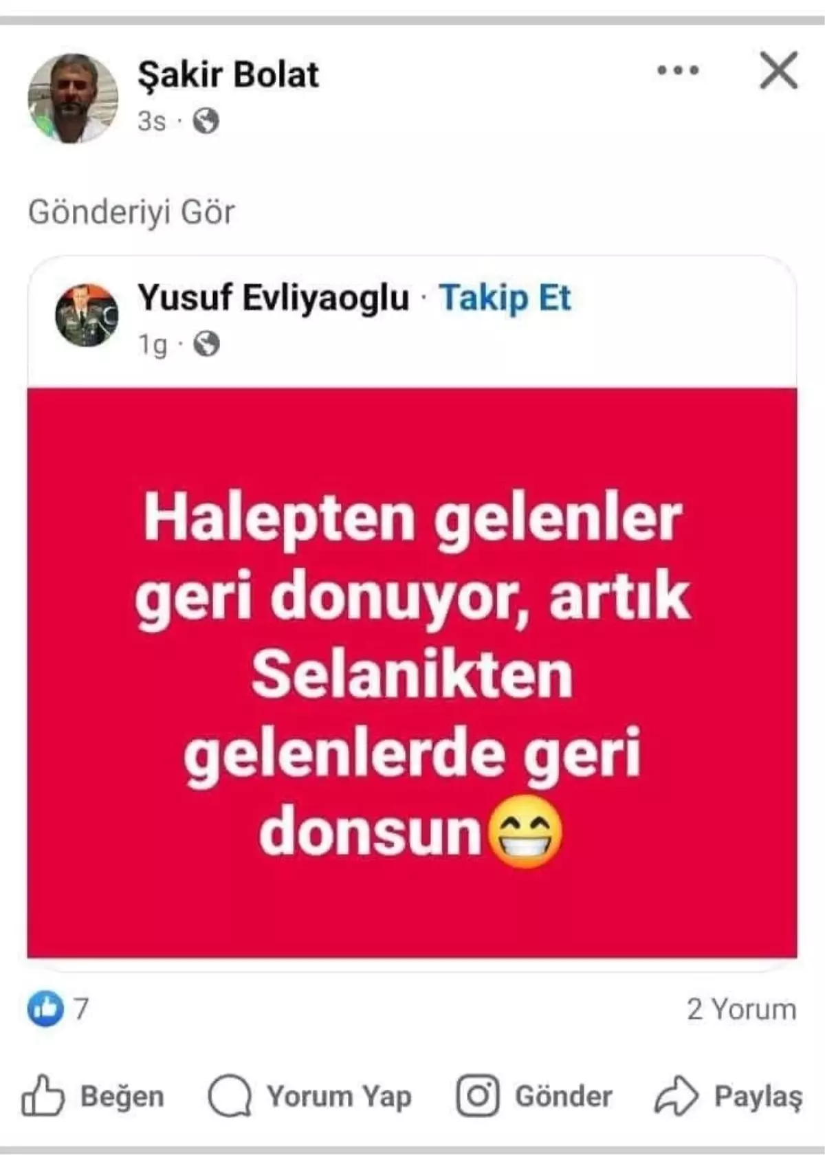 Yusuf Evliyaoğlu isimli kullanıcı, sosyal medya hesabından, “Halep’ten gelenler geri dönüyor. Artık Selanik’ten gelenler de geri dönsün” şeklinde paylaşımda bulundu.