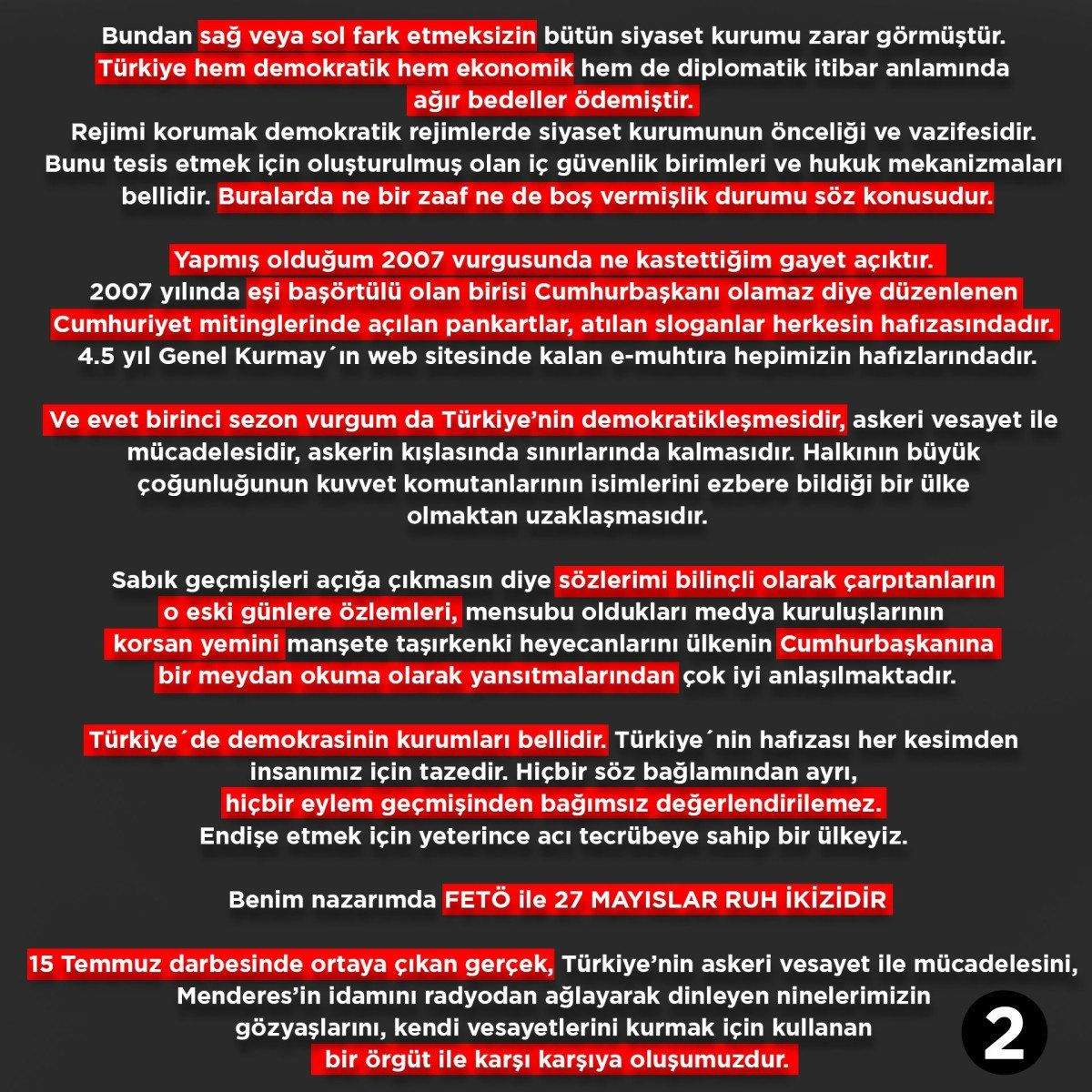 Ün, açıklama metnini ise “Geçtiğimiz günlerde MSÜ’de tecrübesizliklerinin de kurbanı olarak korsan bir yemin icra eden Genç Teğmenlerimizin tutumundan antidemokratik özlemleri depreşen çevrelere yönelik 2007 hatırlatmalı mesajım aynı çevreler tarafından manipüle edilmeye çalışılmıştır.