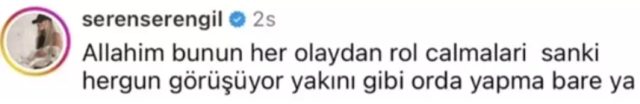 Gülben Ergen’in ağladığı anlara dair bir yorum yapan Seren Serengil, Ergen’in bu duygusal anlarının gerçekçi olmadığını ve “rol çaldığını” iddia etti. Serengil’i “Allah’ım bunun her olaydan rol çalmaları… Sanki her gün görüşüyor, yakını gibi. Orada yapma bari ya!” yazdı.