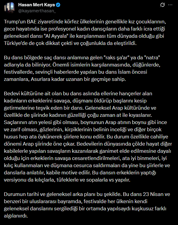 Yazar Hasan Mert Kaya, sosyal medya hesabından söz konusu gösteriyi açıklarken “Trump’un BAE ziyaretinde körfez ülkelerinin genellikle kız çocuklarının, gece hayatında ise profesyonel kadın dansçıların daha farklı icra ettiği geleneksel dansı “Al Ayyala” ile karşılanması tüm dünyada olduğu gibi Türkiye’de de çok dikkat çekti ve çoğunlukla da eleştirildi. Bu dans bölgede saç dansı anlamına gelen “raks şa’ar” ya da “natra” adlarıyla da biliniyor. Önemli isimlerin karşılanmasında, düğünlerde, festivallerde, sevinçli haberlerde yapılan bu dans İslam öncesi zamanlara, Asurlara kadar uzanan bir geçmişe sahip.” ifadelerini kullandı.