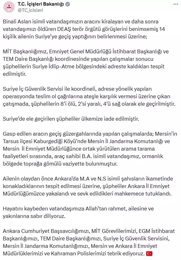 İçişleri Bakanlığı’ndan konuya ilişkin yaptığı açıklamada şu ifadelere yer verildi: “Binali Aslan isimli vatandaşımızın aracını kiralayan ve daha sonra vatandaşımızı öldüren DEAŞ terör örgütü görüşlerini benimsemiş 14 kişilik ailenin Suriye’ye geçiş yaptığının belirlenmesi üzerine; MİT Başkanlığımız, Emniyet Genel Müdürlüğü İstihbarat Başkanlığı ve TEM Daire Başkanlığı koordinesinde yapılan çalışmalar sonucu şüphelilerin Suriye İdlip-Atme bölgesindeki adreste kaldıkları tespit edilmiştir.