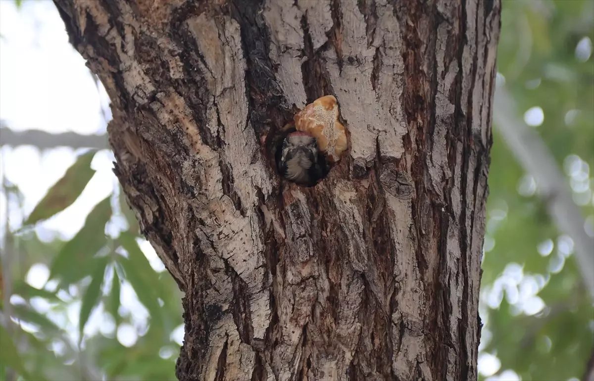 Iğdır İl Özel İdaresi bahçesindeki bir ağacın kovuğuna yuva yapan alaca ağaçkakan yavrusu, kurum çalışanlarının ilgi odağı haline geldi.
