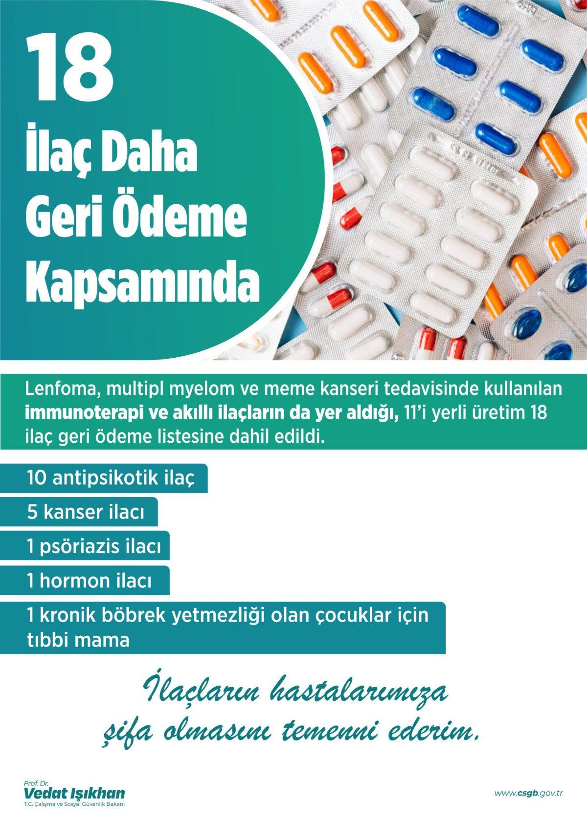Bakan Işıkhan paylaşımında, 10 antipsikotik ilaç, 5 kanser ilacı, 1 psöriazis ilacı, 1 vazodilatör şok ve özofagus varis kanaması için acil müdahale ilacı, 1 kronik böbrek yetmezliği bulunan çocuk hastalar için tıbbi mamanın geri ödeme listesine dahil edildiğini bildirdi.