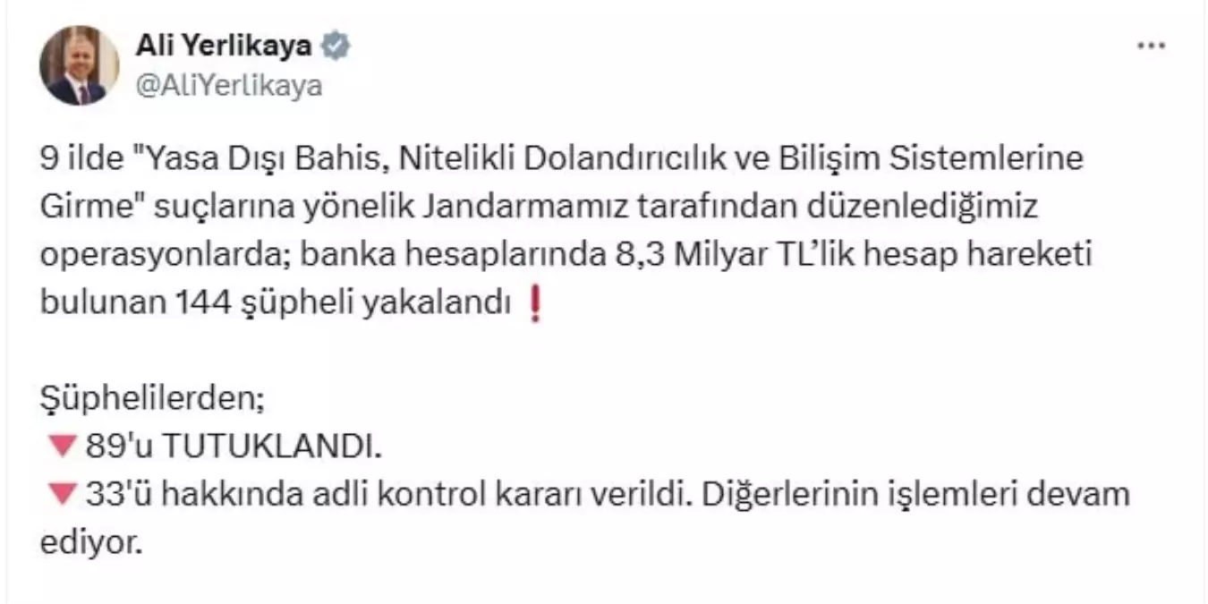 İçişleri Bakanı Ali Yerlikaya, siber suçlara yönelik jandarma tarafından 9 ilde düzenlenen operasyonu sosyal medya hesabından paylaştı. Buna göre; ‘Yasa dışı bahis’, ‘Nitelikli dolandırıcılık’ ve ‘Bilişim sistemlerine girme’ suçlarına yönelik yürütülen operasyonda, banka hesaplarında 8,3 milyar TL’lik hareketlilik bulunan 144 şüpheli yakalandı. Ekiplerin aramalarında, çok sayıda doküman ve dijital materyal ele geçirildi. Şüphelilerden 89’u çıkarıldıkları hakimliklerce tutuklandı, 33’ü hakkında adli kontrol kararı verildi, diğerlerinin işlemleri devam ediyor.