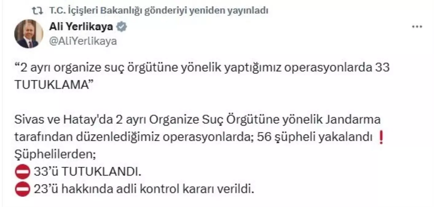 İÇİŞLERİ Bakanı Ali Yerlikaya, Sivas ve Hatay merkezli 10 ilde 2 ayrı organize suç örgütüne yönelik operasyonda 56 şüphelinin yakalandığını, 33’ünün tutuklandığını açıkladı.