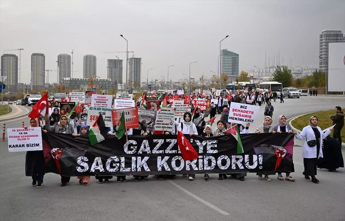 Uluslararası Sağlık İnisiyatifince düzenlenen, Ankara Filistin Dayanışma Platformunun (ANFİDAP) destek verdiği programda, çeşitli şehirlerden gelen sağlık çalışanları, Ankara İl Sağlık Müdürlüğünden Etlik Şehir Hastanesi önüne yürüdü.