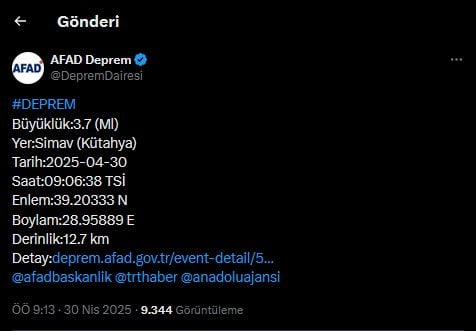 Kütahya Simav’da 3.7 büyüklüğünde deprem meydana geldi.