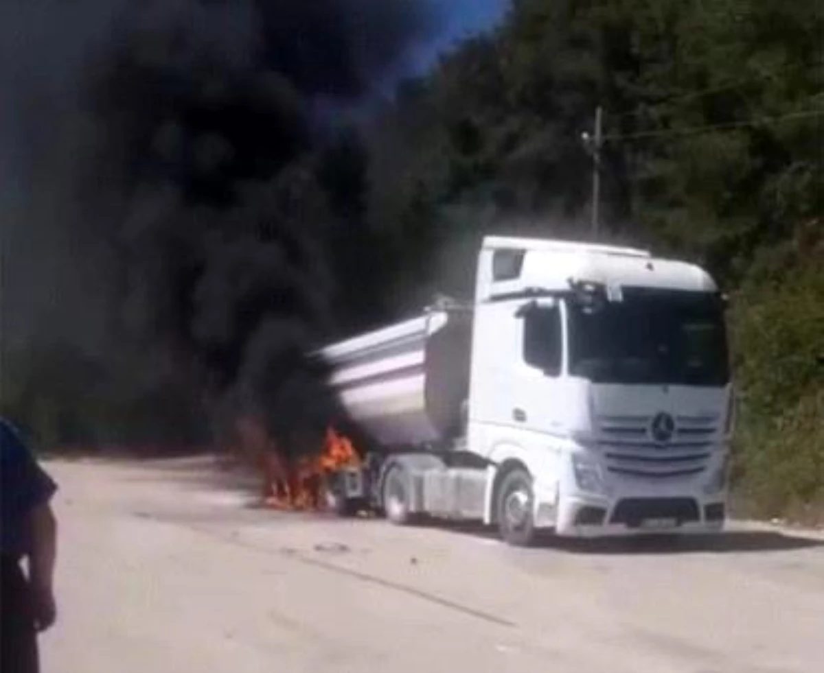Sinop’ta hafriyat yüklü kamyonun balatalarının ısınması sonucu lastikleri alev aldı.
