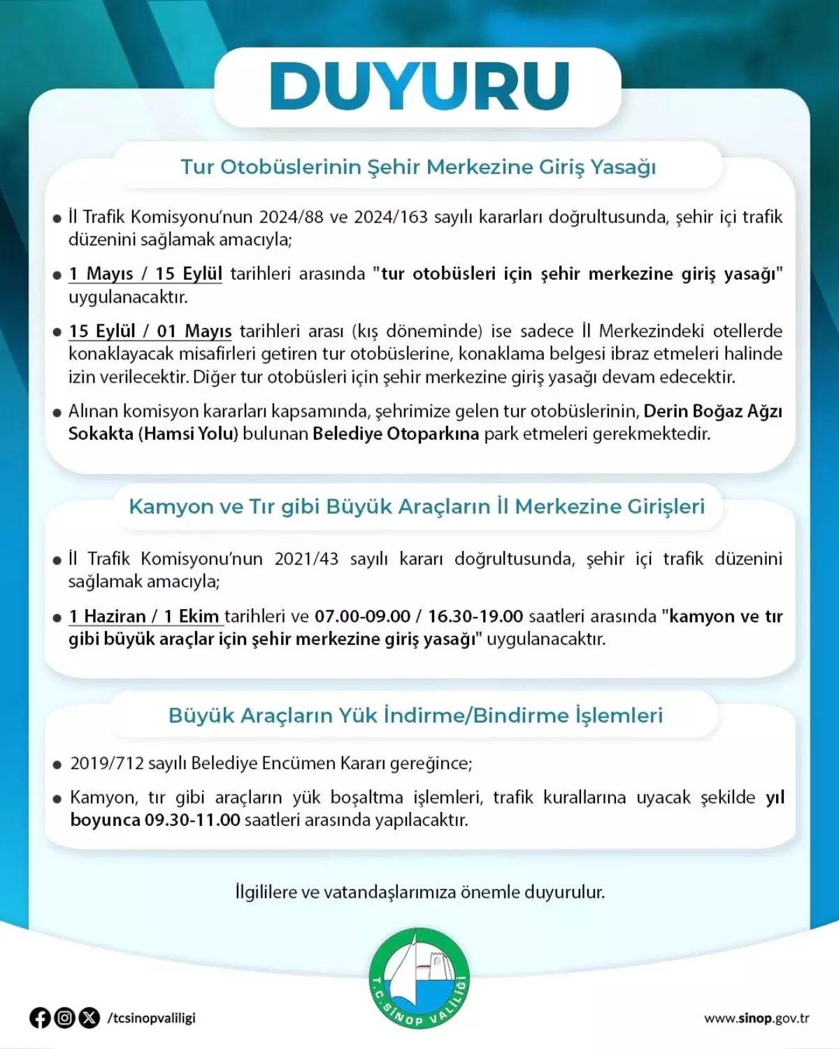 Sinop İl Trafik Komisyonu, 1 Mayıs-15 Eylül tarihleri arasında tur otobüslerinin şehir merkezine girişini yasakladı. Kış döneminde ise sadece otellerde konaklayan misafirleri taşıyan otobüslere belirli koşullarla izin verilecek.