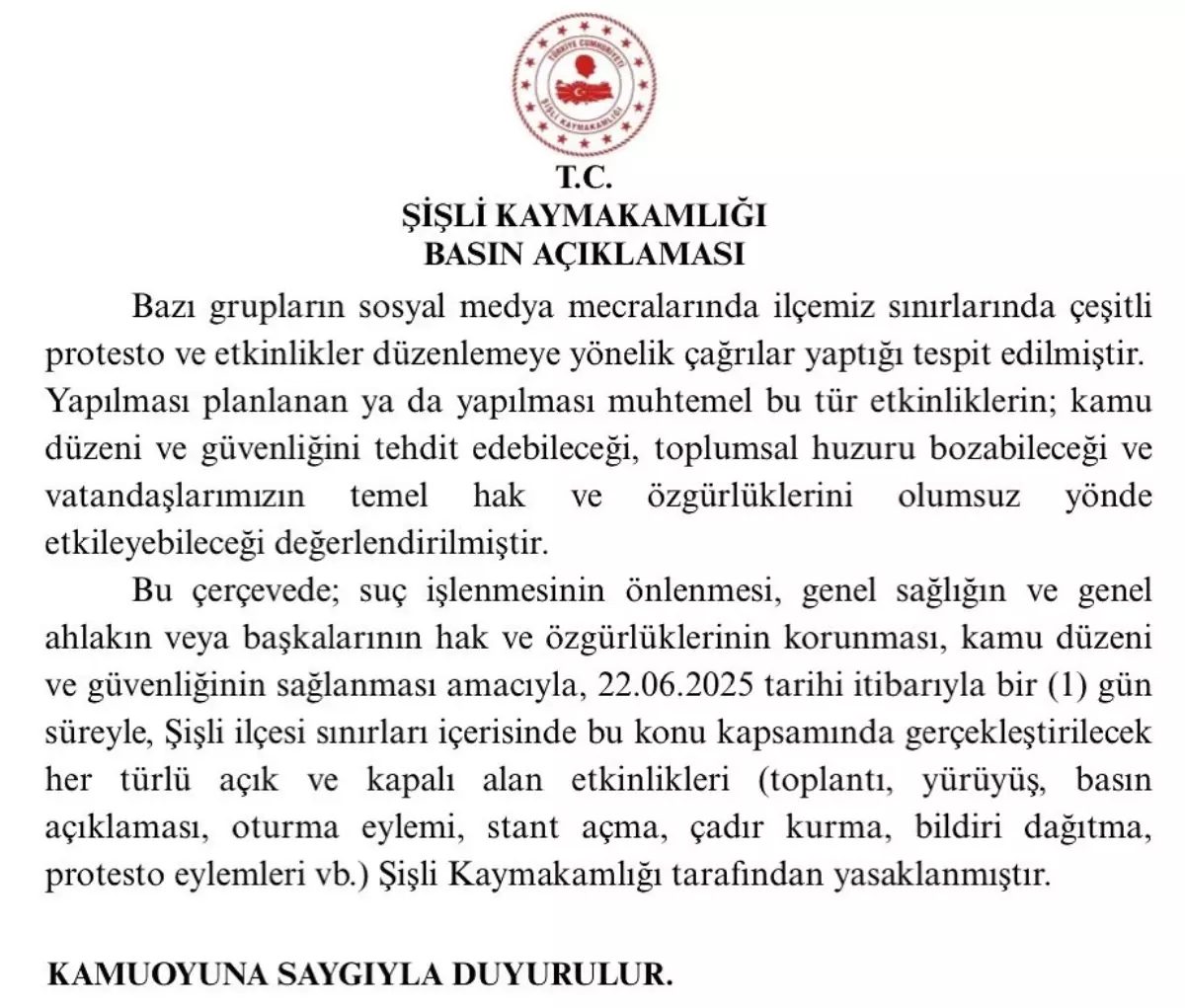 Açıklamada, “Bazı grupların sosyal medya mecralarında ilçemiz sınırlarında çeşitli protesto ve etkinlikler düzenlemeye yönelik çağrılar yaptığı tespit edilmiştir. Yapılması planlanan ya da yapılması muhtemel bu tür etkinliklerin; kamu düzeni ve güvenliğini tehdit edebileceği, toplumsal huzuru bozabileceği ve olumsuz yönde vatandaşlarımızın temel hak ve özgürlüklerini etkileyebileceği değerlendirilmiştir. Bu çerçevede; suç işlenmesinin önlenmesi, genel sağlığın ve genel ahlakın veya başkalarının hak ve özgürlüklerinin korunması, kamu düzeni ve güvenliğinin sağlanması amacıyla, 22.06.2025 tarihi itibarıyla bir (1) gün süreyle, Şişli ilçesi sınırları içerisinde bu konu kapsamında gerçekleştirilecek her türlü açık ve kapalı alan etkinlikleri (toplantı, yürüyüş, basın açıklaması, oturma eylemi, stant açma, çadır kurma, bildiri dağıtma, protesto eylemleri vb.) Şişli Kaymakamlığı tarafından yasaklanmıştır.” İfadeleri kullanıldı.