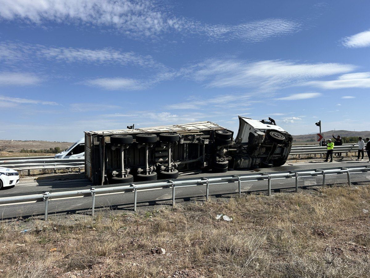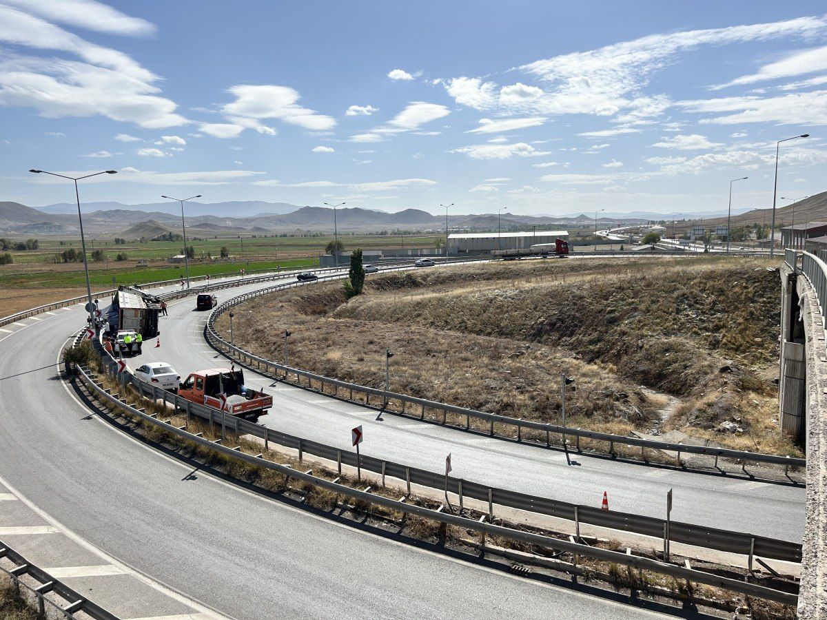 Şarkışla istikametinden Sivas istikametine gelen Ramazan Könez idaresindeki mermer yüklü tır, Kovalı Kavşağı’nda 380 derecelik yay şeklindeki keskin virajı alamayarak devrildi.